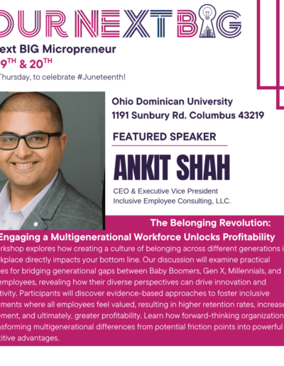 professional journey, specifically in the lens of P-20. Now, due to his diverse educational and professional journey, he can use all his experiences to work with the multi-generational professionals to assist with their diverse talent management, culture, and engagement needs across organizations and industries. Ankit currently serves as the Vice President for the Central Ohio Belonging Consortium and leads their overall membership and programming efforts for the organization. He also serves on the Workforce Development Committee at the Columbus Chamber of Commerce.