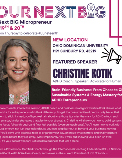 Ever feel like running your business is a never-ending game of whack-a-mole—juggling ideas, fighting distractions, and ending each day more exhausted than when you started? If you have an ADHD brain, you’re not alone… and you’re not broken. In this down-to-earth, interactive session, ADHD coach and business strategist Christine Kotik shares what actually works for entrepreneurs who think differently. Forget the one-size-fits-all productivity hacks that never seem to stick. Instead, you’ll get real talk about why those tips miss the mark for ADHD minds, and discover smarter, kinder strategies that play to your strengths. Christine will show you how to build systems that make focus, follow-through, and flow feel possible (even on tough days). You’ll learn how to work with your natural energy, not just your calendar, so you can keep burnout at bay and your business moving forward. You’ll leave with practical tools to organize your day, prioritize what matters, and finally capture those big ideas before they slip away. Most importantly, you’ll walk out knowing your brain isn’t the problem.. it’s your secret weapon! Let’s build a business that lets it shine.