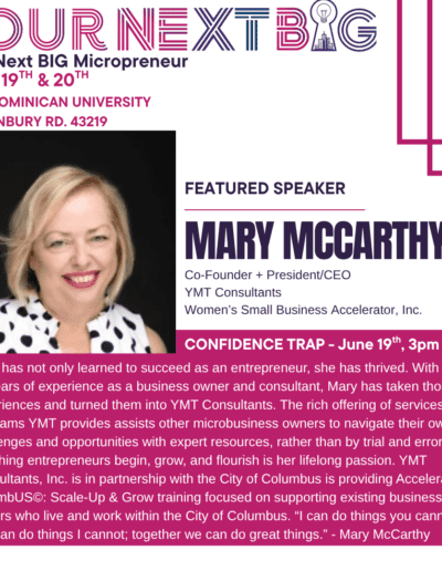 Mary McCarthy, Founder/President & CEO, has 20+ years of experience as an entrepreneur and sixteen years as the owner and founder of YMT Consultants, Inc., a business consulting and development firm that helps existing businesses grow past the million-dollar revenue mark. McCarthy has extensive experience helping business owners develop ideas, coordinate funding plans, increase revenue, and create jobs. McCarthy co-founded the Women’s Small Business Accelerator in 2012 training and mentoring over 2,000 women business owners from concept through seven figures through training, mentoring, and connections. In 2002, she co-founded Accelerating Angels an angel fund investing in high-growth, female led businesses. McCarthy is on the Minority Finance Business Advisory Board (appointed by Ohio Governor Mike DeWine), is a founding member of the Ohio Women’s Coalition, an Ohio state-wide advocacy group, and sits on the National Association of Women Business Owners Columbus chapter advisory board.