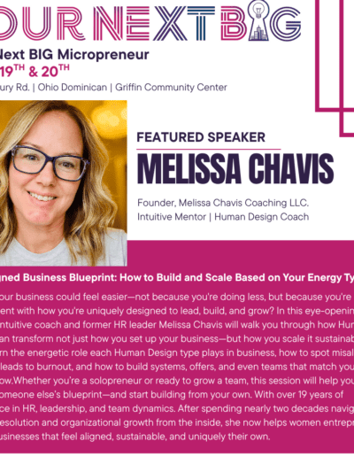 What if your business could feel easier—not because you're doing less, but because you're doing it in alignment with how you're uniquely designed to lead, build, and grow? In this eye-opening session, intuitive coach and former HR leader Melissa Chavis will walk you through how Human Design can transform not just how you set up your business—but how you scale it sustainably. You'll learn the energetic role each Human Design type plays in business, how to spot misalignment before it leads to burnout, and how to build systems, offers, and even teams that match your natural flow.Whether you’re a solopreneur or ready to grow a team, this session will help you stop forcing someone else’s blueprint—and start building from your own. With over 19 years of experience in HR, leadership, and team dynamics. After spending nearly two decades navigating conflict resolution and organizational growth from the inside, she now helps women entrepreneurs create businesses that feel aligned, sustainable, and uniquely their own.
